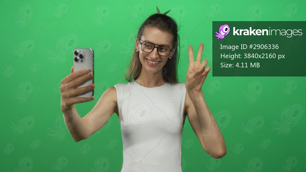 Young woman holding smartphone and making finger heart and peace sign in green studio; joy connection.