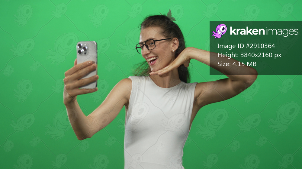 Young woman holding smartphone and making finger heart and peace sign in green studio; joy connection.