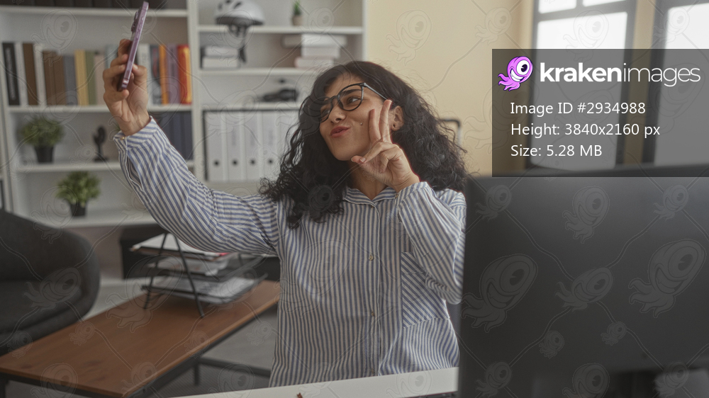 Young woman holding smartphone and making peace sign at her desk in office building; playful confidence.