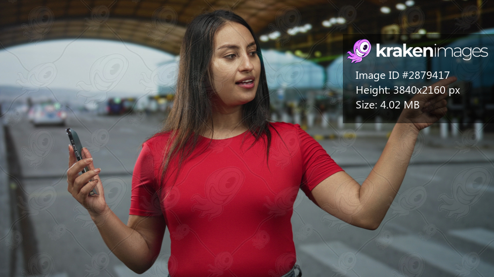 Young woman holding smartphone and points finger toward airport terminal curbside while wearing a red shirt; travel confidence.