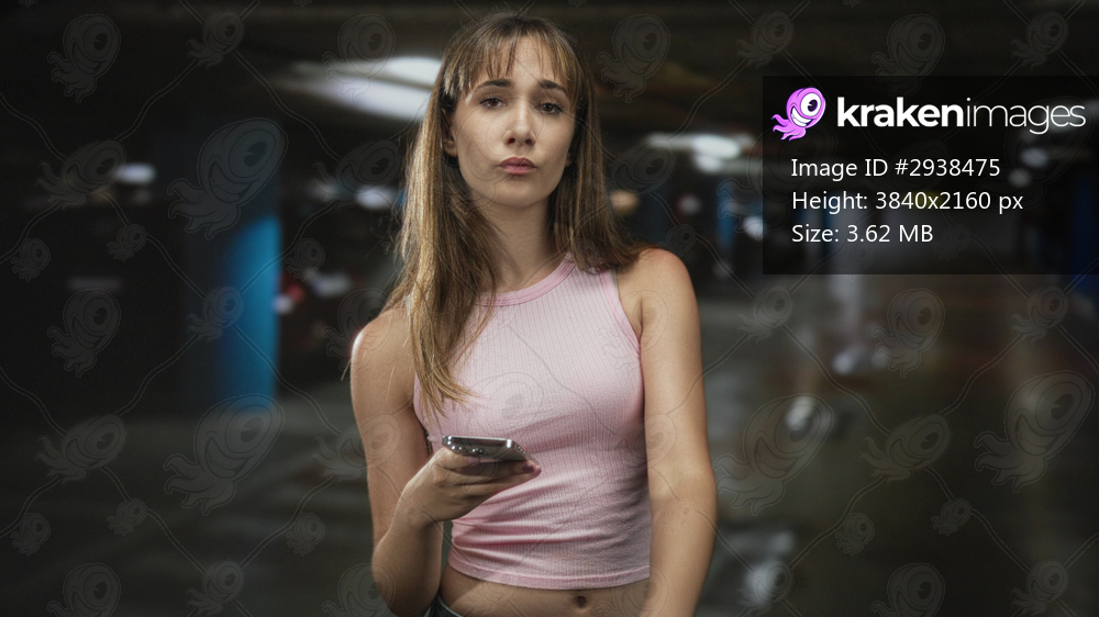 Young woman holding smartphone and scrolling with thumb, showing navel while standing in a building parking garage; concentration.