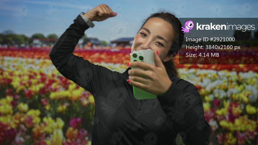Young woman holding smartphone and smiling in studio with vibrant tulip field backdrop and visible hand with red nails; joy.