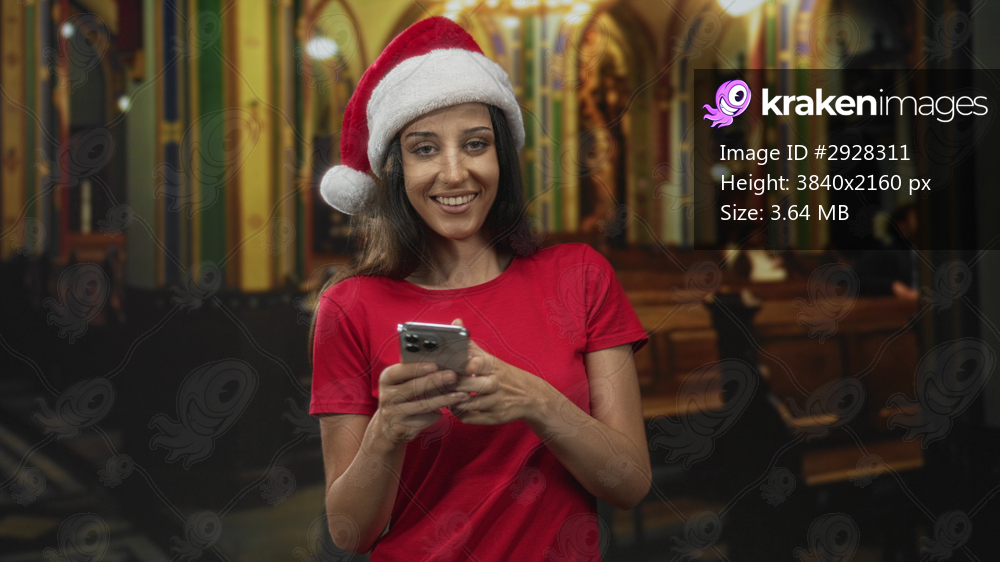 Young woman holding smartphone and smiling inside church wearing red shirt and santa hat; joy faith celebration.