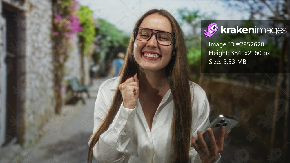 Young woman holding smartphone, tapping screen and making a fist pump on street with a big smile; joy celebration success.