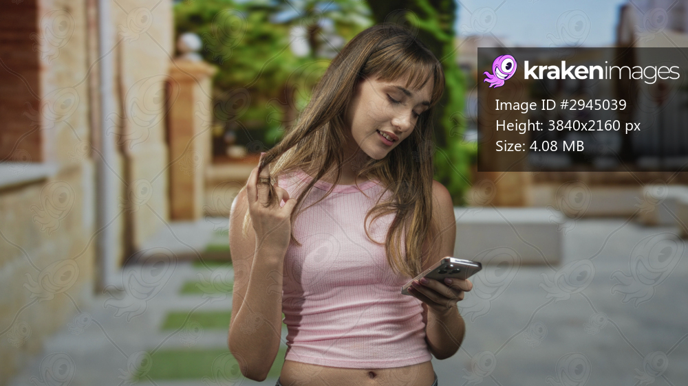 Young woman holding smartphone and touching hair on sunlit street by stone building, smiling with closed eyes, wearing pink crop top and jeans; serenity daydream. - Kraken Images