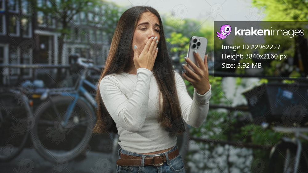 Young woman holding smartphone waving and touching chest on a street canal bridge; longing virtual farewell.