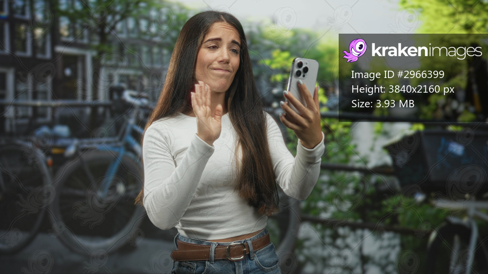 Young woman holding smartphone waving and touching chest on a street canal bridge; longing virtual farewell.