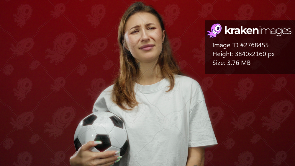 Young woman holding soccer ball appears sad against isolated red background wall, wearing white shirt, looking distressed, expressing emotion in sports context. - Kraken Images