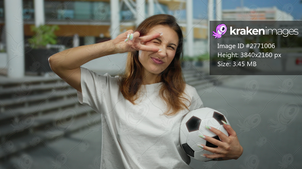 Young woman holding soccer ball gesturing peace sign outdoors in urban city street during daytime.