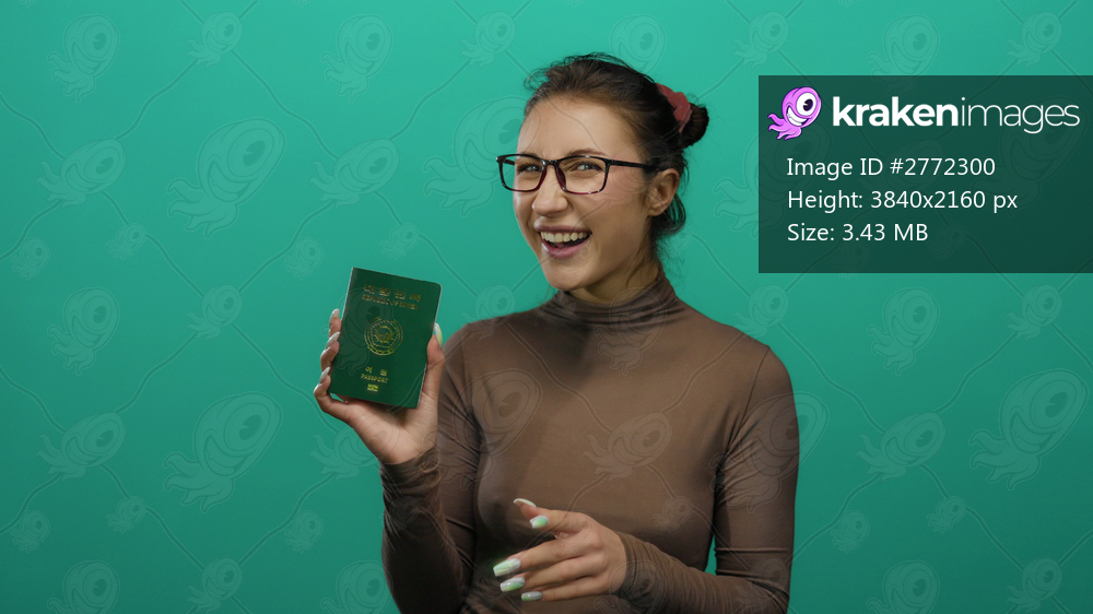 Young woman holding south korean passport smiles confidently against an isolated green background wall, showcasing identification and visa travel concept. - Kraken Images