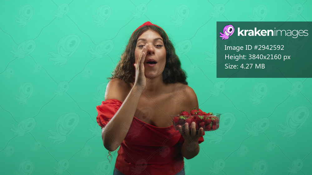 Young woman holding strawberries and hand to mouth gesture in studio wearing red top and headband; playful summer joy.