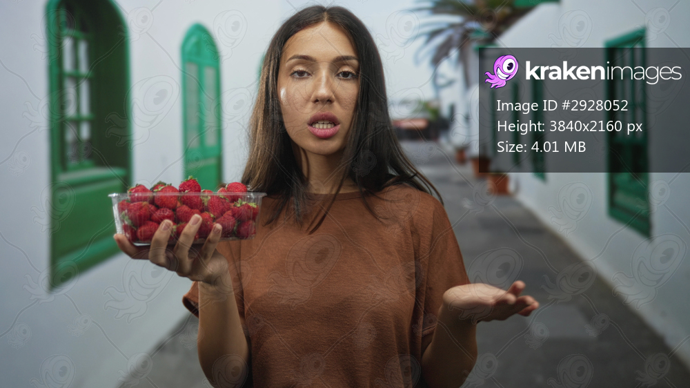 Young woman holding strawberries in one hand on a street with white building and green shutters; inviting summer snack.