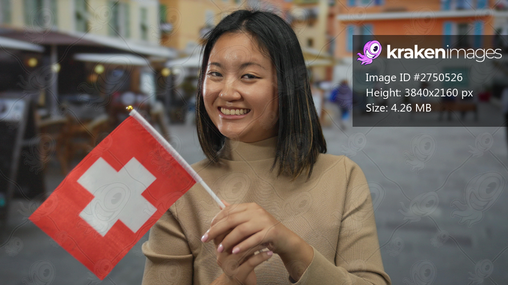 Young woman holding swiss flag outdoors with a joyful expression representing travel and cultural pride on a lively street in switzerland.