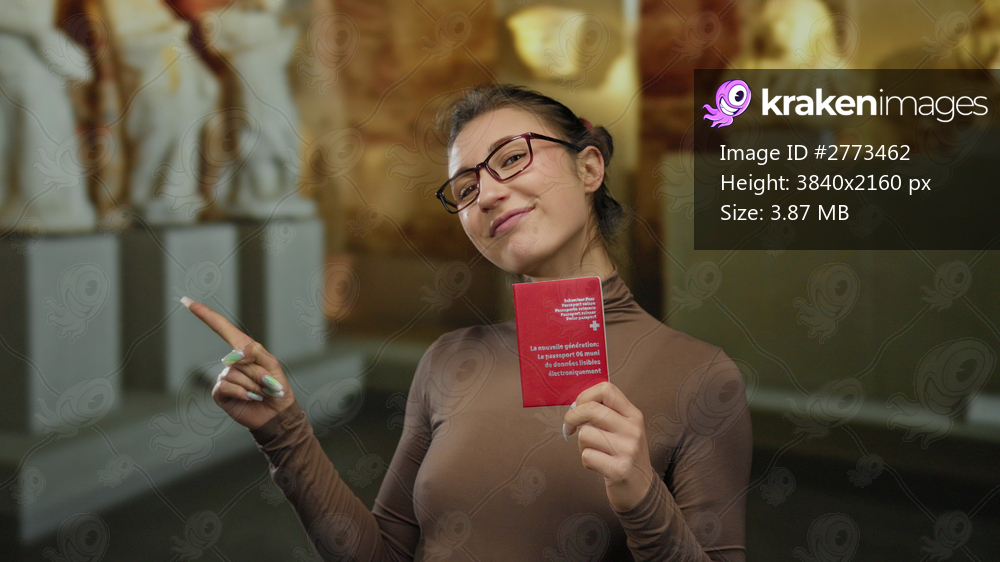 Young woman holding swiss passport pointing indoors at museum showcasing art and culture surrounded by sculptures of ancient figures implying travel and identity theme. - Kraken Images