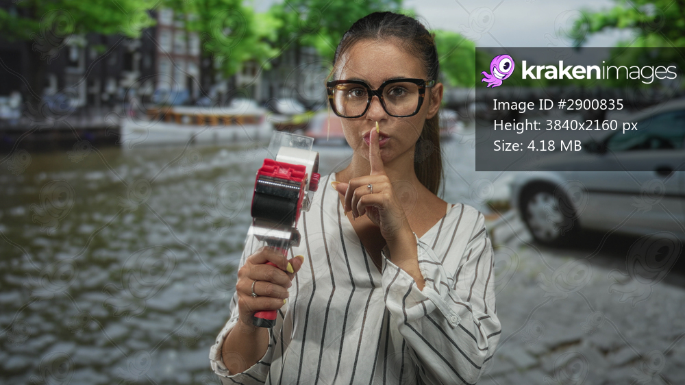 Young woman holding tape dispenser and finger to lips for silence on amsterdam street; quiet secrecy.