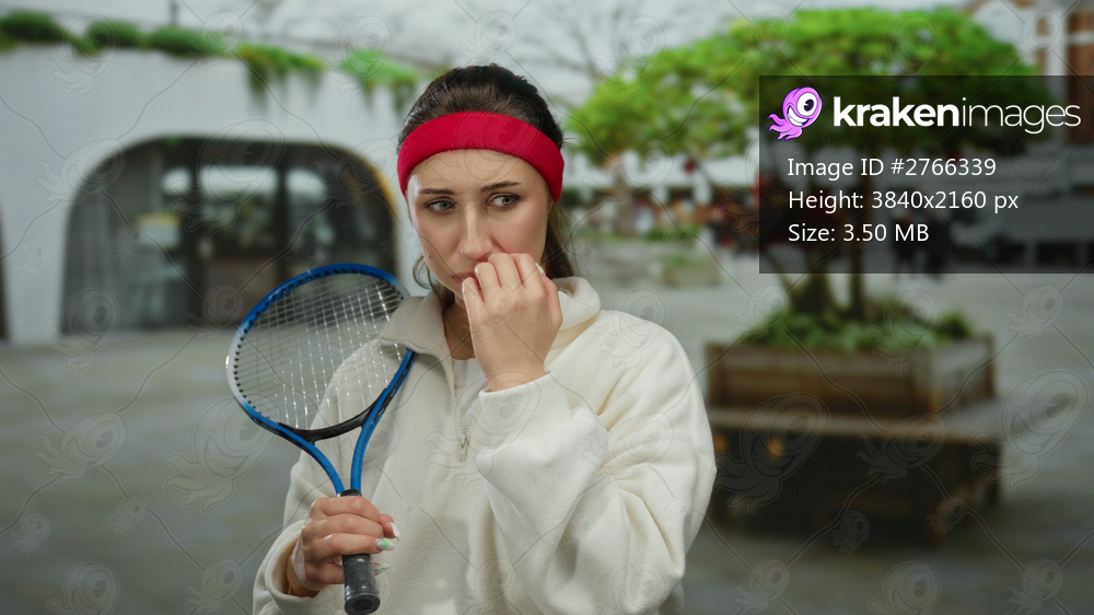 Young woman holding tennis racket outdoors in city street, wearing red headband and white sweatshirt, appears thoughtful amid urban scenery and greenery - Kraken Images