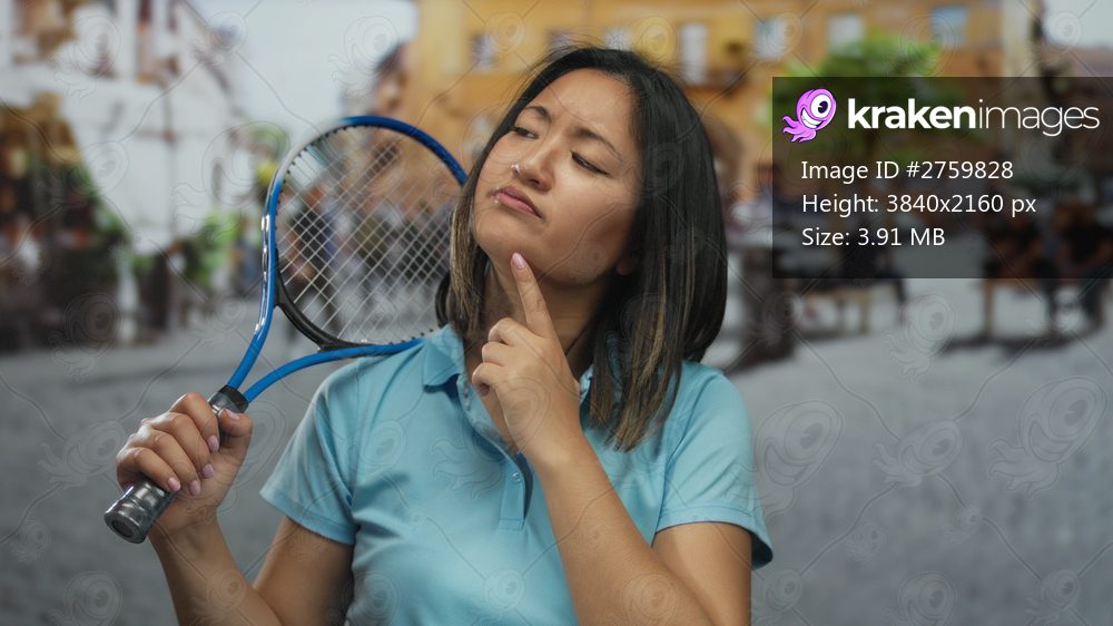 Young woman holding tennis racket standing in city street pondering with thoughtful expression, showcasing outdoor urban lifestyle.