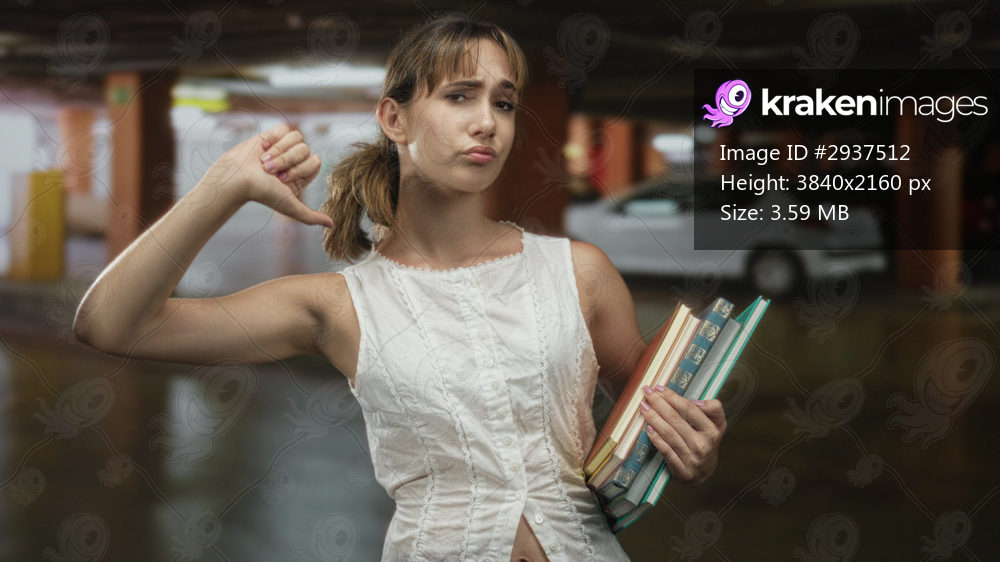 Young woman holding textbooks and folders shows thumbs down in parking building next to parked car; study struggle frustration.