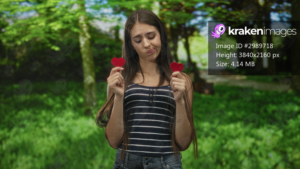 Young woman holding two red felt hearts in both hands, pouting and looking down in a forest; heartbreak reflection.