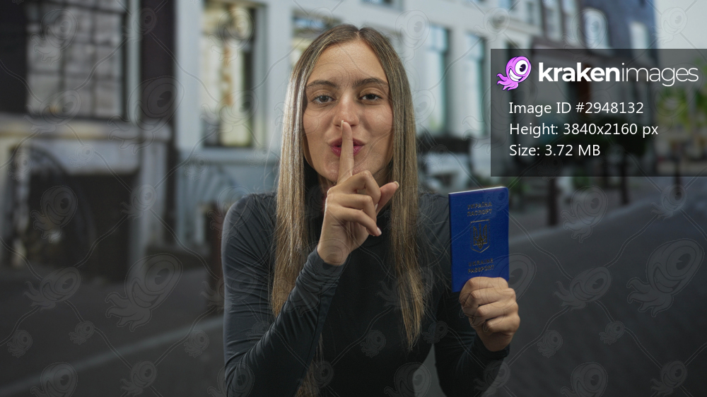 Young woman holding ukrainian passport up with finger to lips for silence on a cobbled city street; secrecy travel migration.
