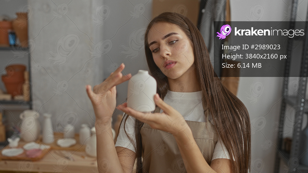 Young woman holding unfinished ceramic vase with fingertips in a pottery studio inspecting shape and glaze; calm focus.