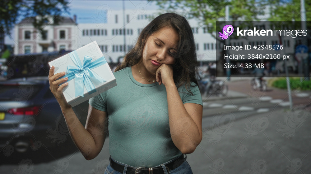 Young woman holding white gift box with blue ribbon, hand on cheek and closed eyes on city street; disappointment.