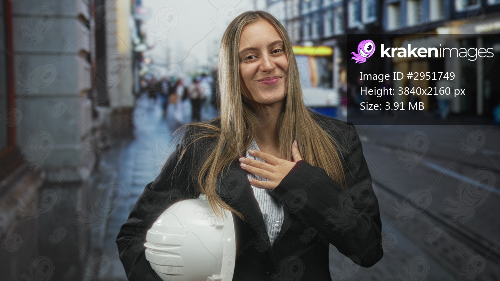 Young woman holding white hardhat with hand on chest smiling on busy street with tram and shops in view; career pride.