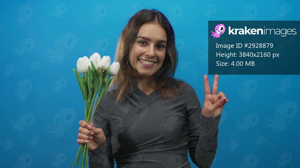Young woman holding white tulips and flashing peace sign in studio with blue backdrop and grey top; joy celebration.