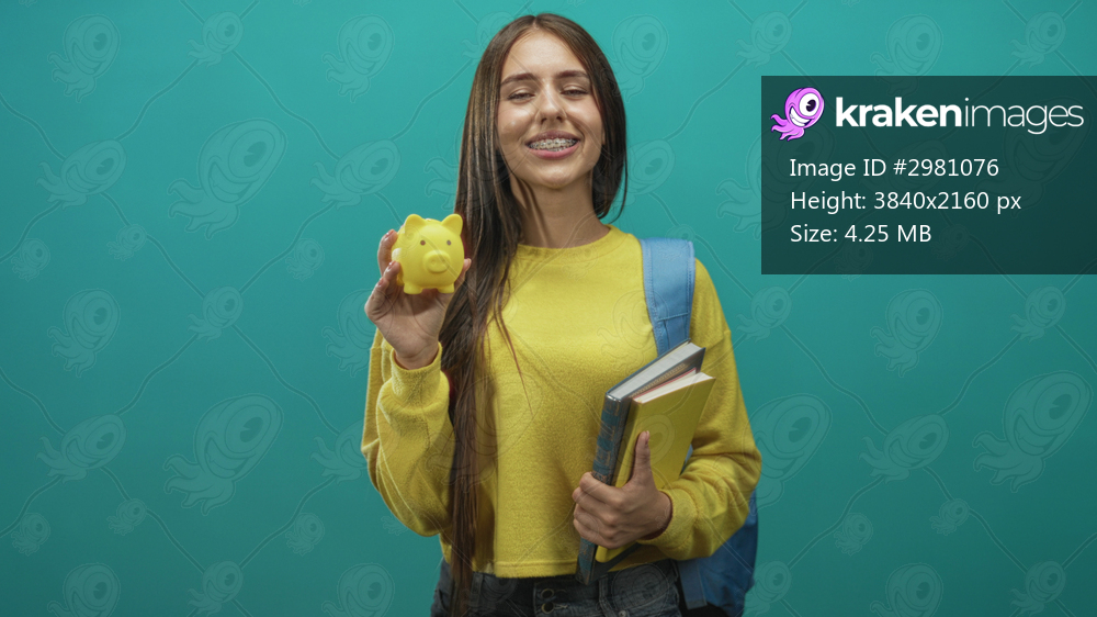 Young woman holding yellow piggybank and books, puckers lips to piggybank while wearing backpack in studio; saving optimism.