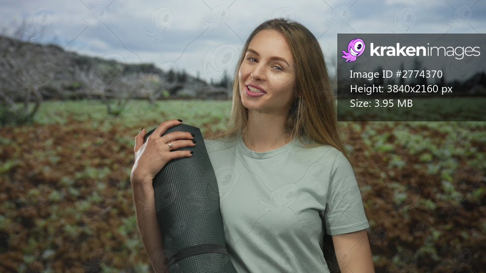 Young woman holding yoga mat in green field under cloudy sky, wearing casual clothes, represents outdoor relaxation and healthy lifestyle in natural setting with rustic background. - Kraken Images