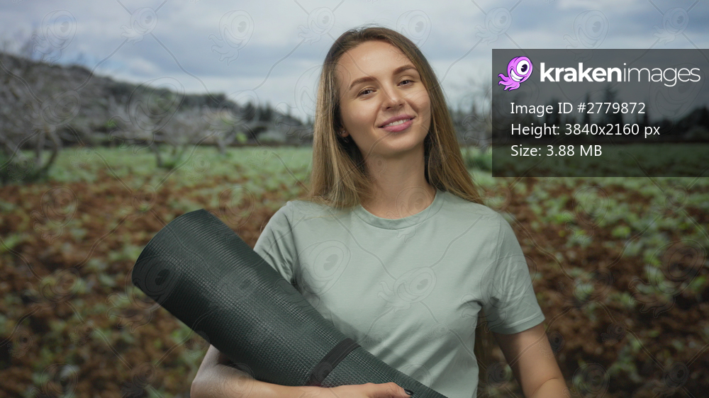 Young woman holding yoga mat in green field under cloudy sky, wearing casual clothes, represents outdoor relaxation and healthy lifestyle in natural setting with rustic background. - Kraken Images