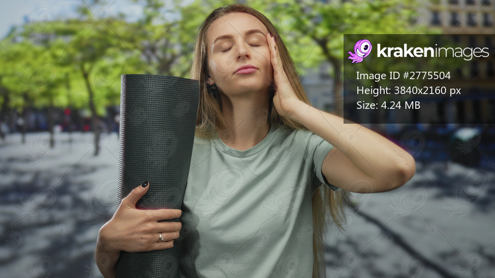 Young woman holding yoga mat on city street looks stressed, surrounded by urban trees and buildings.
