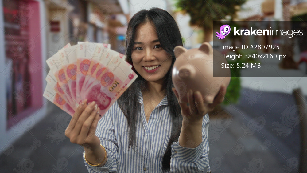 Young woman holding yuan banknotes and piggy bank smiling on a busy outdoor street showcasing savings and financial success