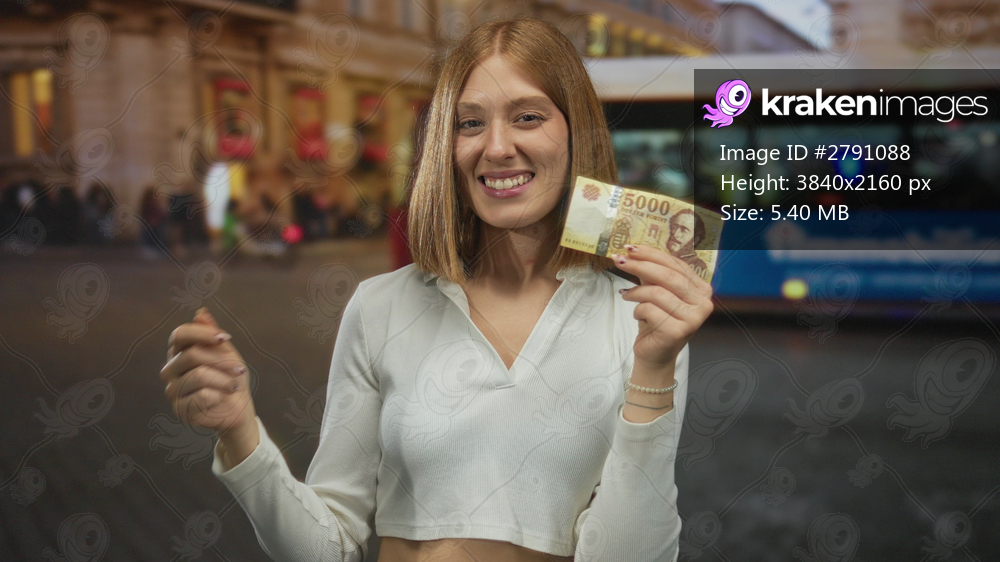 Young woman holds 5000 forint banknote on urban street at night, highlighting hungarian currency with vibrant outdoor city ambiance.