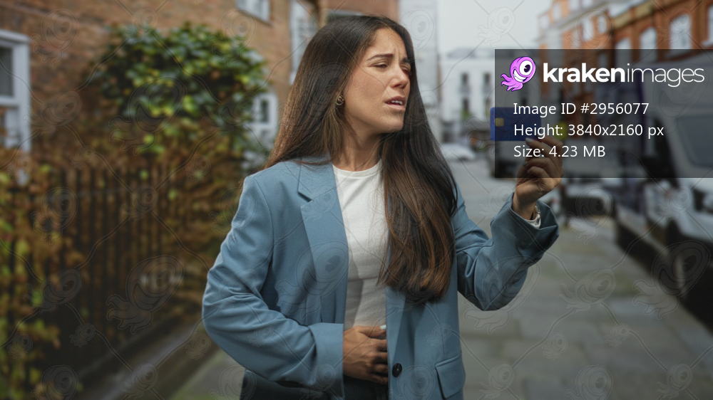 Young woman holds a blue creditcard in her hand while clutching her stomach and frowning on a city street lined with vans and brick buildings; financial frustration. - Kraken Images