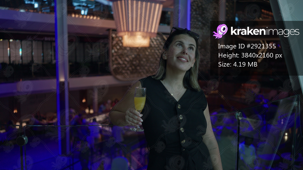 Young woman holds a champagne flute and sips orange drink on a glass balcony inside a building; celebration night out.