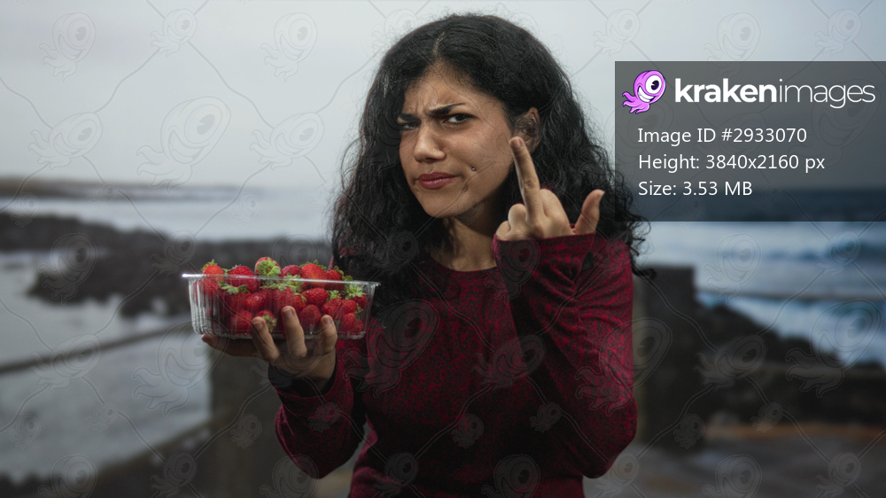 Young woman holds a clear plastic container of strawberries and raises middle finger in studio by the coast; defiance offering.