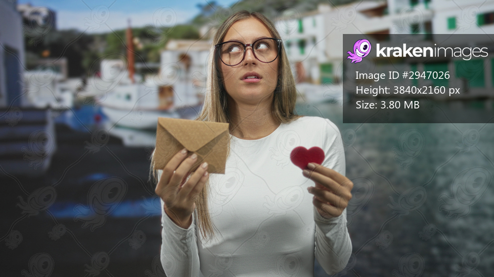 Young woman holds a kraft envelope and a small red heart prop in a studio setting while wearing glasses; romantic doubt.