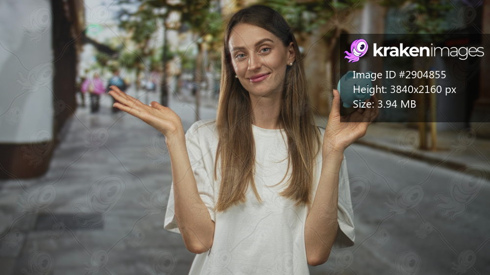 Young woman holds blue piggy bank in right hand with palm up gesture on a city street lined with buildings and trees; saving optimism.