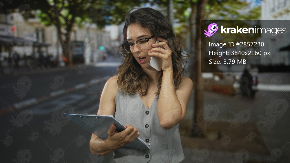 Young woman holds clipboard and talks on smartphone while standing by city sidewalk in street; determination.