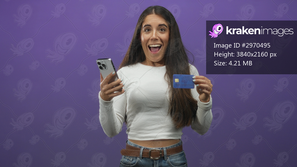 Young woman holds creditcard in one hand and smartphone in the other, hand visible, smiling in a studio; excitement.