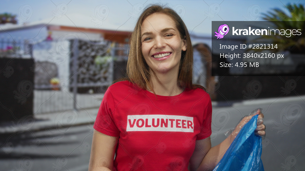 Young woman holds crushed plastic bottle and blue trash bag with gloves on street; sustainability effort.