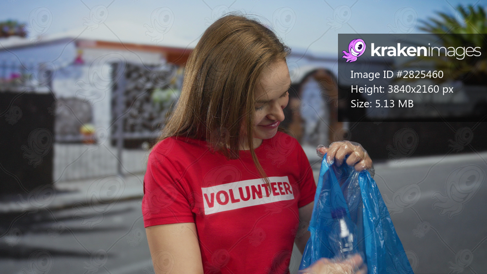 Young woman holds crushed plastic bottle and blue trash bag with gloves on street; sustainability effort.