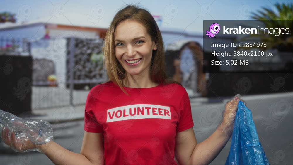 Young woman holds crushed plastic bottle and blue trash bag with gloves on street; sustainability effort.