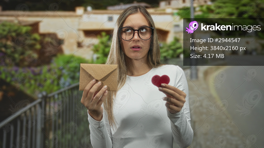Young woman holds envelope and red heart in hands on a cobblestone street, wearing glasses and white top; uncertainty decision.