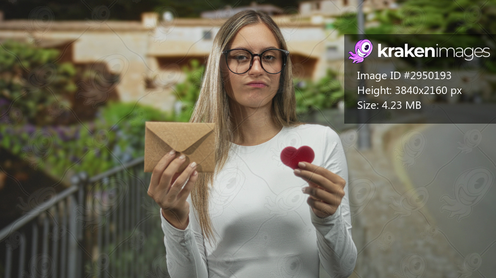 Young woman holds envelope and red heart in hands on a cobblestone street, wearing glasses and white top; uncertainty decision.