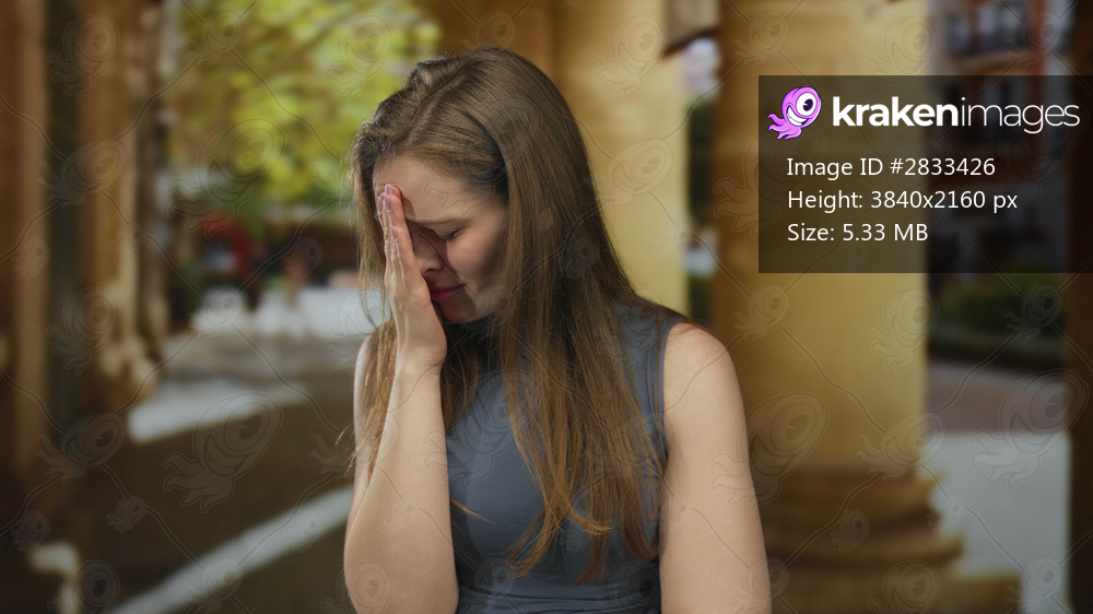Young woman holds forehead with hand on busy city street under stone archway showing discomfort in daylight; stress.