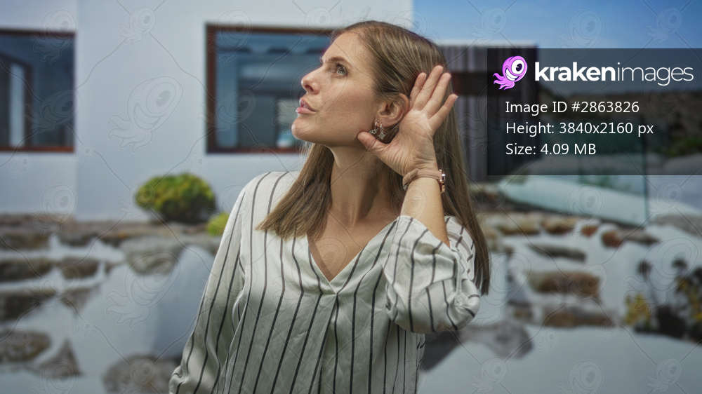 Young woman holds hand to her ear listening intently outside a white building entrance; attentive curiosity.