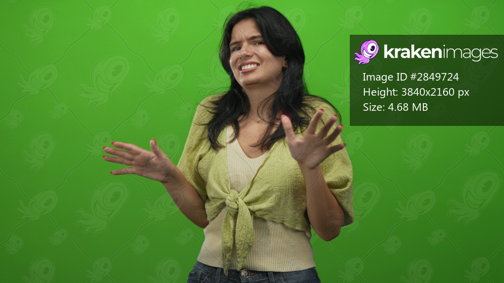 Young woman holds hands up for rejection in studio with grimaced facial expression and tense posture; disgust revulsion repulsion loathing.