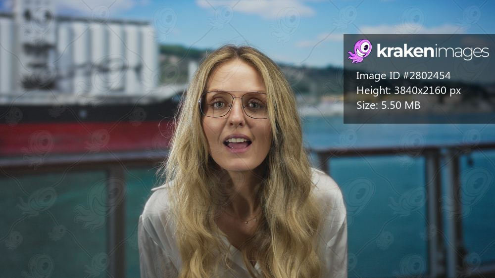 Young woman holds her hand calling aboard a boat by a blonde cruise deck outdoors with a friendly wave and beckon.